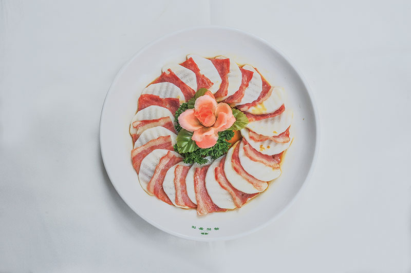4.將培根按山藥片大小切片依次間隔擺盤,撒上青椒段、胡蘿卜絲即可食用。
